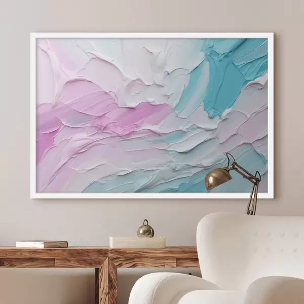 Poster Een abstract olieverfschilderij met dikke streken roze, witte en turquoise verf, waardoor een structuureffect ontstaat Nr f43393