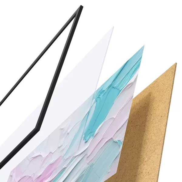 De poster bestaat uit een frame, plexiglas, geprinte afbeelding en spaanplaat achterkant. De poster kan meteen aan de muur worden gehangen dankzij de bevestigingen op de achterkant.