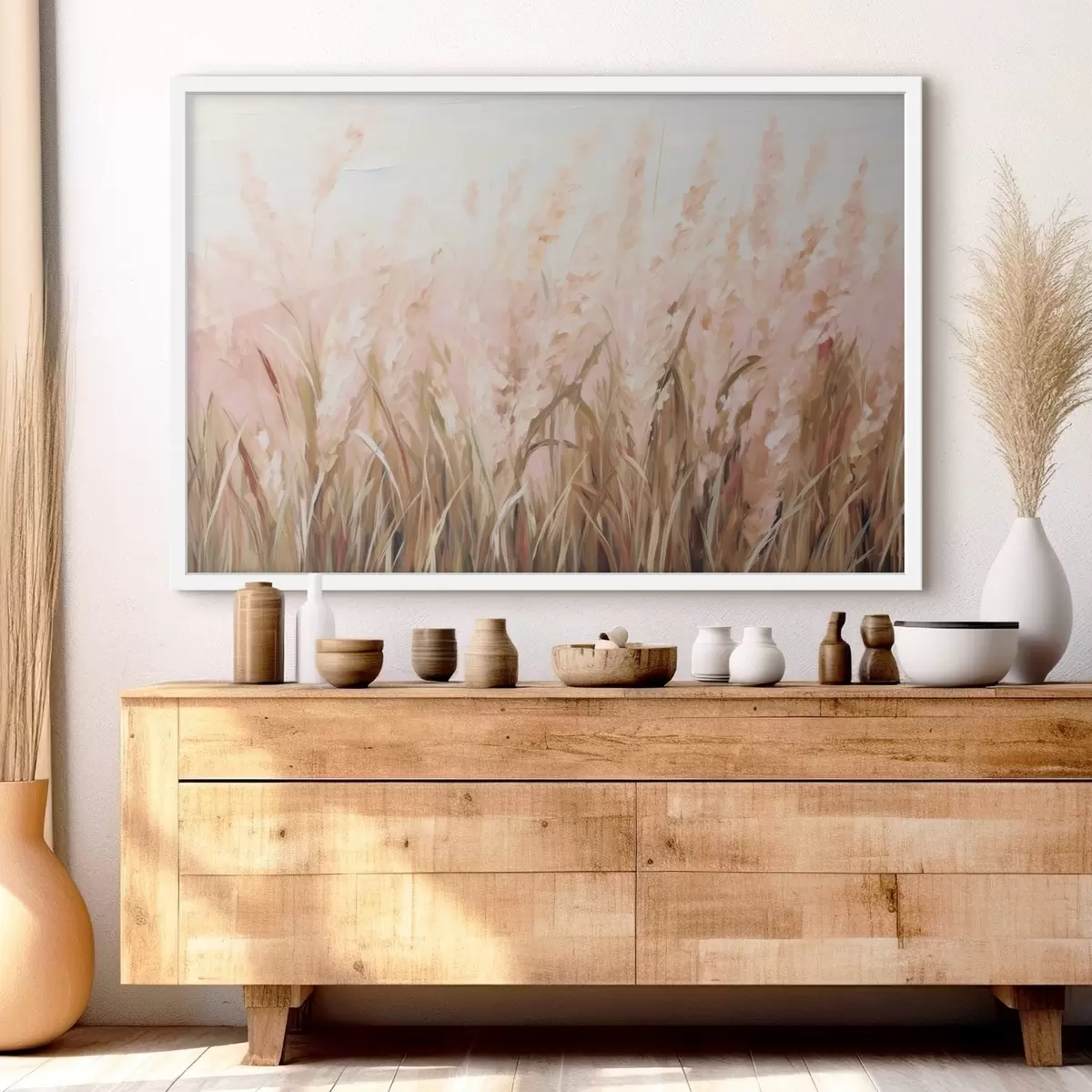 Poster Pampasgrasveld met roze en bruine tinten, zachte penseelstreken, abstract olieverfschilderij kunstimitatie Nr f43403