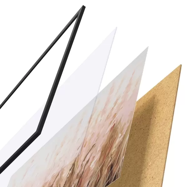 De poster bestaat uit een frame, plexiglas, geprinte afbeelding en spaanplaat achterkant. De poster kan meteen aan de muur worden gehangen dankzij de bevestigingen op de achterkant.