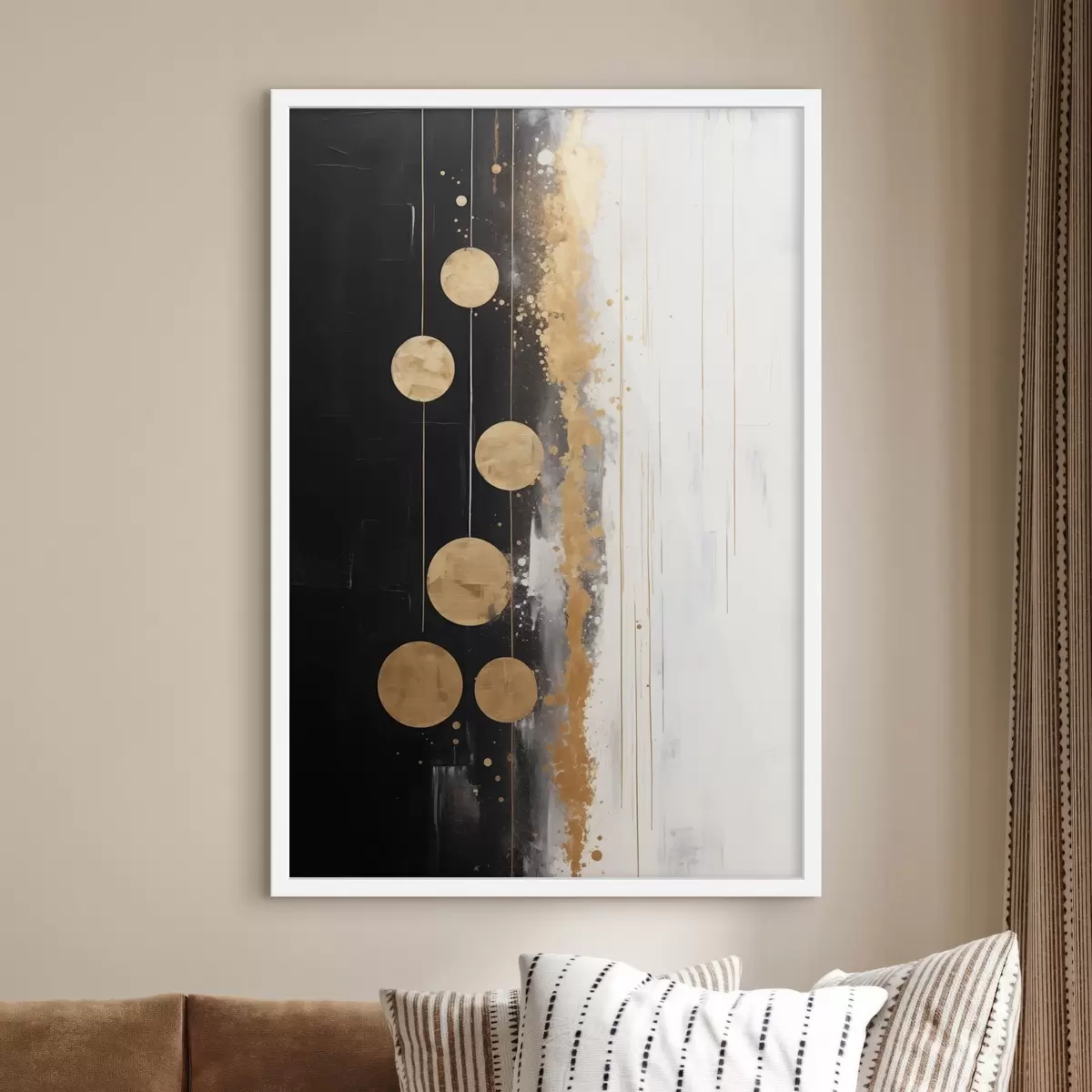Poster Abstracte kunst met gele cirkels op zwarte en witte achtergrond met witte en gele vlekken Nr f43410