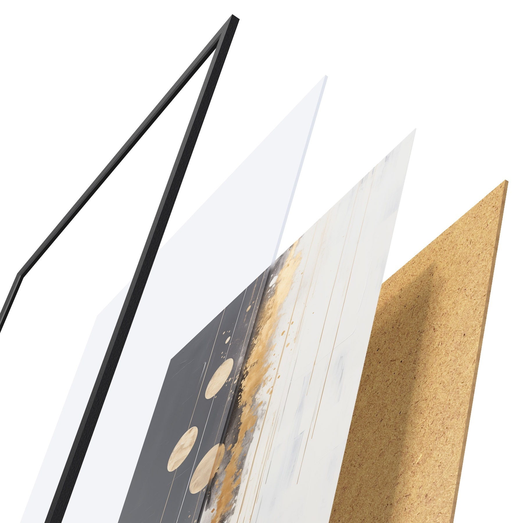 De poster bestaat uit een frame, plexiglas, geprinte afbeelding en spaanplaat achterkant. De poster kan meteen aan de muur worden gehangen dankzij de bevestigingen op de achterkant.