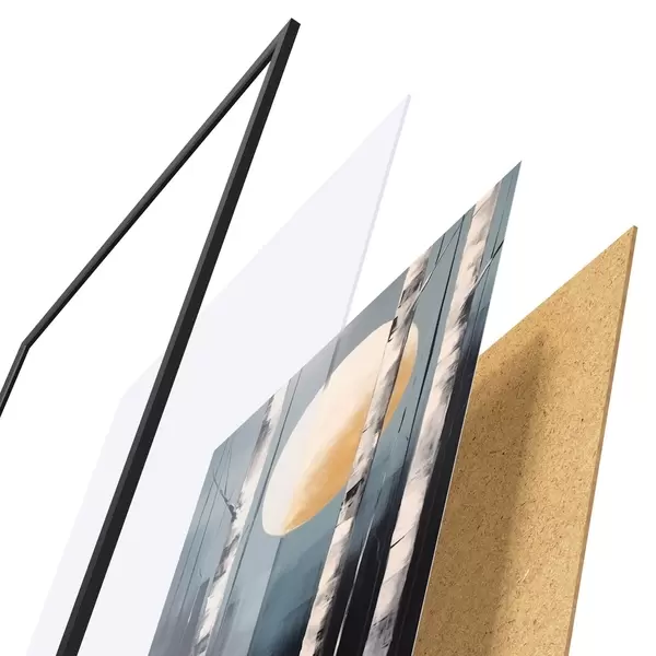 De poster bestaat uit een frame, plexiglas, geprinte afbeelding en spaanplaat achterkant. De poster kan meteen aan de muur worden gehangen dankzij de bevestigingen op de achterkant.