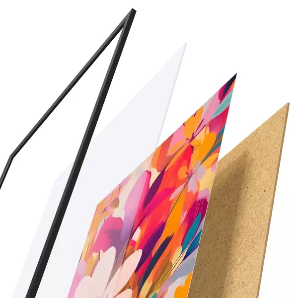 De poster bestaat uit een frame, plexiglas, geprinte afbeelding en spaanplaat achterkant. De poster kan meteen aan de muur worden gehangen dankzij de bevestigingen op de achterkant.