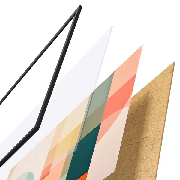 De poster bestaat uit een frame, plexiglas, geprinte afbeelding en spaanplaat achterkant. De poster kan meteen aan de muur worden gehangen dankzij de bevestigingen op de achterkant.