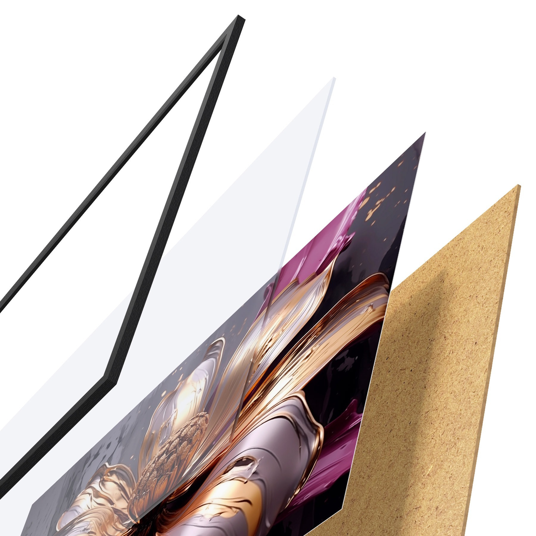 De poster bestaat uit een frame, plexiglas, geprinte afbeelding en spaanplaat achterkant. De poster kan meteen aan de muur worden gehangen dankzij de bevestigingen op de achterkant.