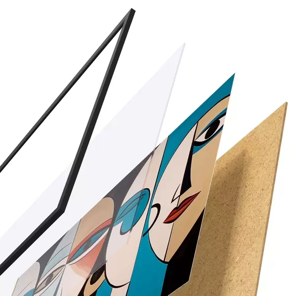 De poster bestaat uit een frame, plexiglas, geprinte afbeelding en spaanplaat achterkant. De poster kan meteen aan de muur worden gehangen dankzij de bevestigingen op de achterkant.