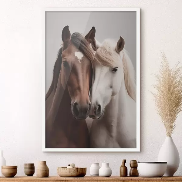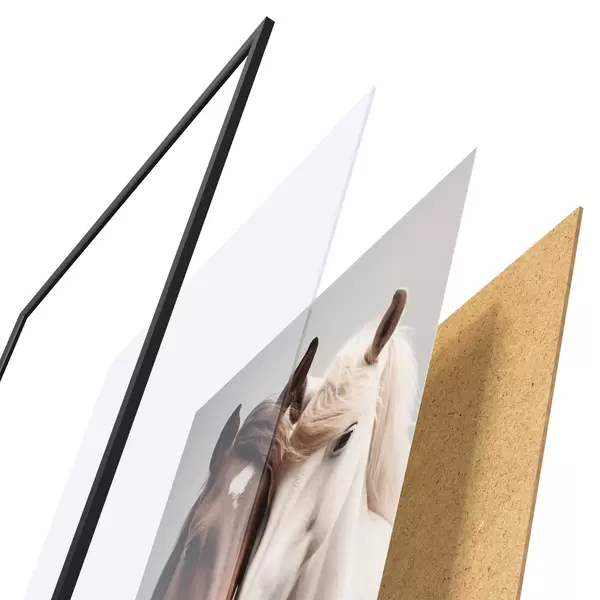 De poster bestaat uit een frame, plexiglas, geprinte afbeelding en spaanplaat achterkant. De poster kan meteen aan de muur worden gehangen dankzij de bevestigingen op de achterkant.