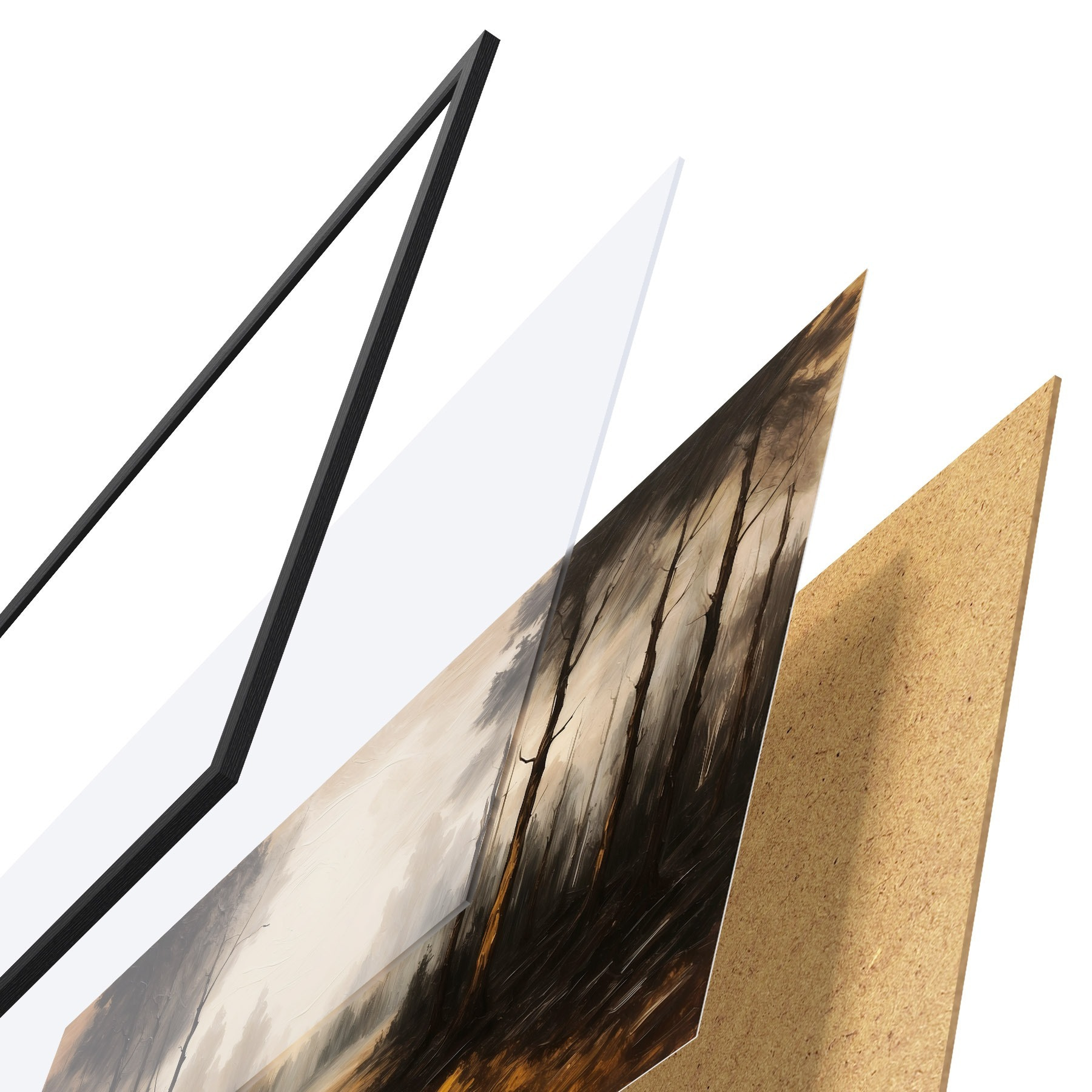 De poster bestaat uit een frame, plexiglas, geprinte afbeelding en spaanplaat achterkant. De poster kan meteen aan de muur worden gehangen dankzij de bevestigingen op de achterkant.