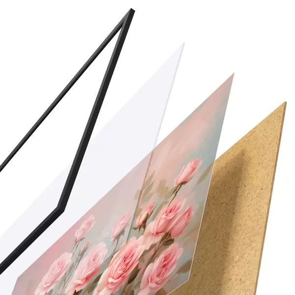 De poster bestaat uit een frame, plexiglas, geprinte afbeelding en spaanplaat achterkant. De poster kan meteen aan de muur worden gehangen dankzij de bevestigingen op de achterkant.