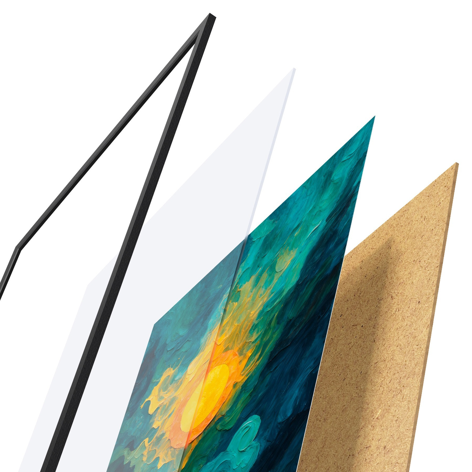 De poster bestaat uit een frame, plexiglas, geprinte afbeelding en spaanplaat achterkant. De poster kan meteen aan de muur worden gehangen dankzij de bevestigingen op de achterkant.
