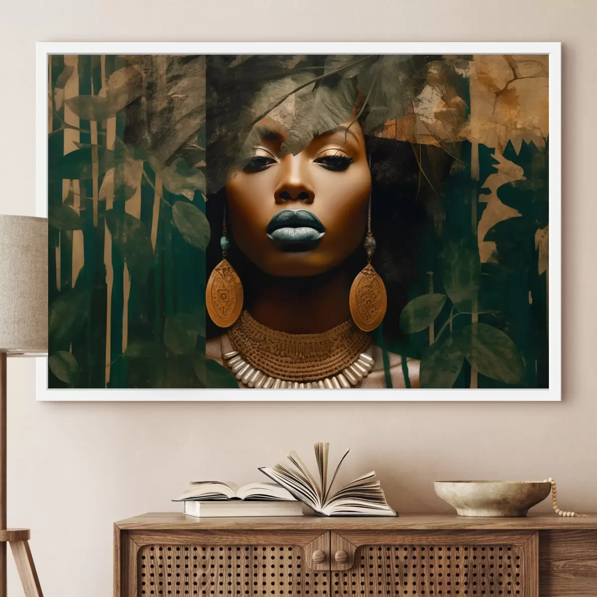 Poster Meisjesgezicht op abstracte bosachtergrond f43466