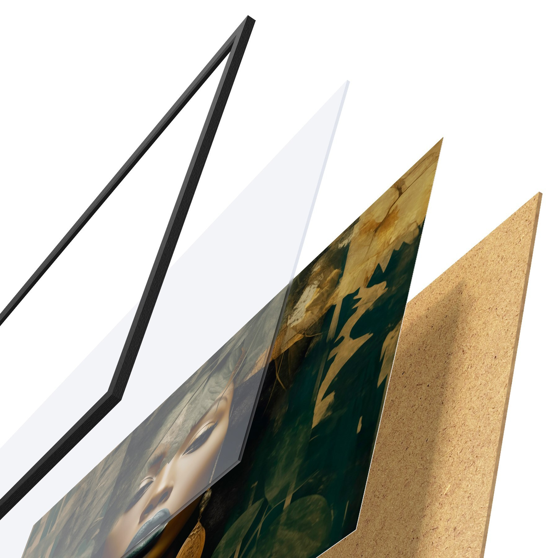 De poster bestaat uit een frame, plexiglas, geprinte afbeelding en spaanplaat achterkant. De poster kan meteen aan de muur worden gehangen dankzij de bevestigingen op de achterkant.