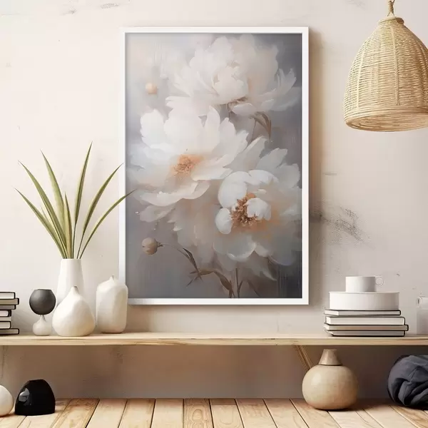 Poster Witte bloemen en stengels op wazige achtergrond f43473