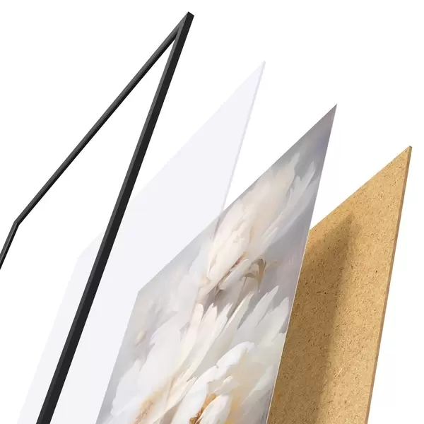 De poster bestaat uit een frame, plexiglas, geprinte afbeelding en spaanplaat achterkant. De poster kan meteen aan de muur worden gehangen dankzij de bevestigingen op de achterkant.