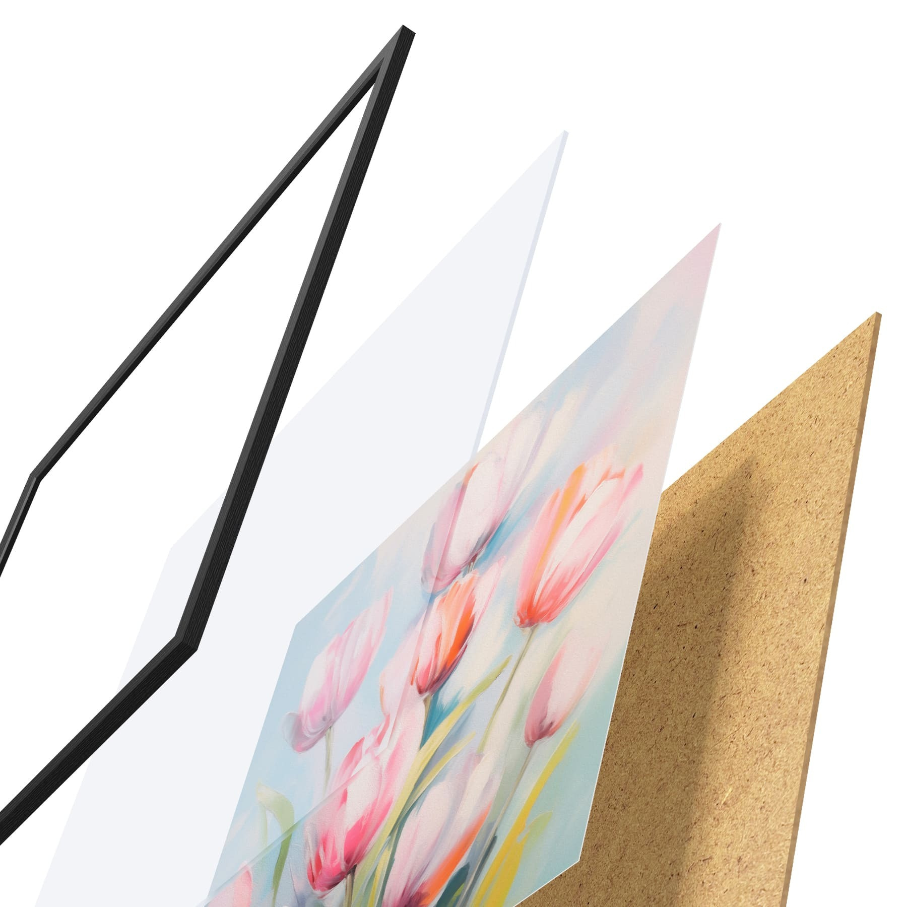 De poster bestaat uit een frame, plexiglas, geprinte afbeelding en spaanplaat achterkant. De poster kan meteen aan de muur worden gehangen dankzij de bevestigingen op de achterkant.