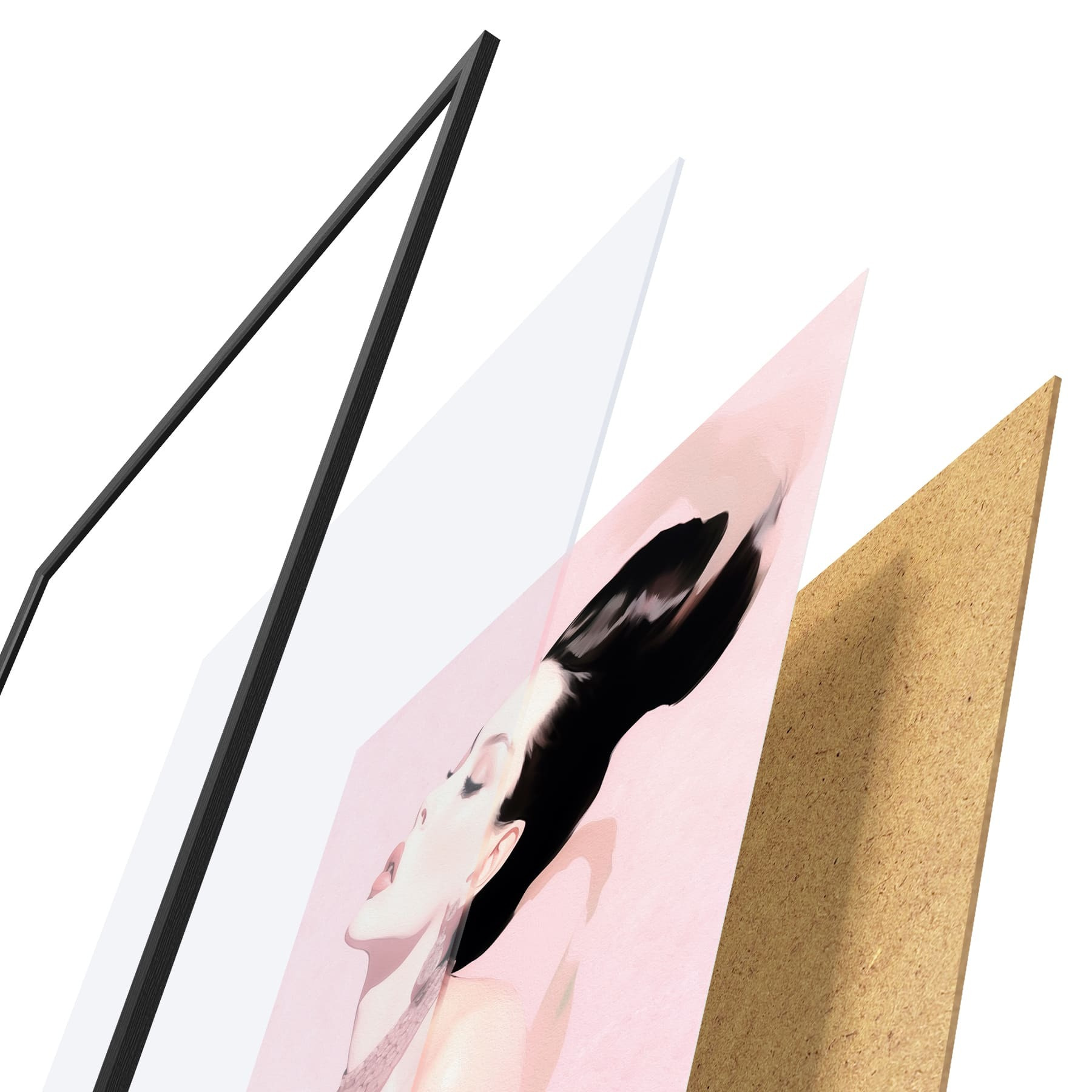 De poster bestaat uit een frame, plexiglas, geprinte afbeelding en spaanplaat achterkant. De poster kan meteen aan de muur worden gehangen dankzij de bevestigingen op de achterkant.