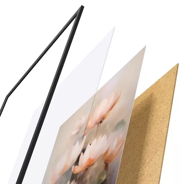 De poster bestaat uit een frame, plexiglas, geprinte afbeelding en spaanplaat achterkant. De poster kan meteen aan de muur worden gehangen dankzij de bevestigingen op de achterkant.