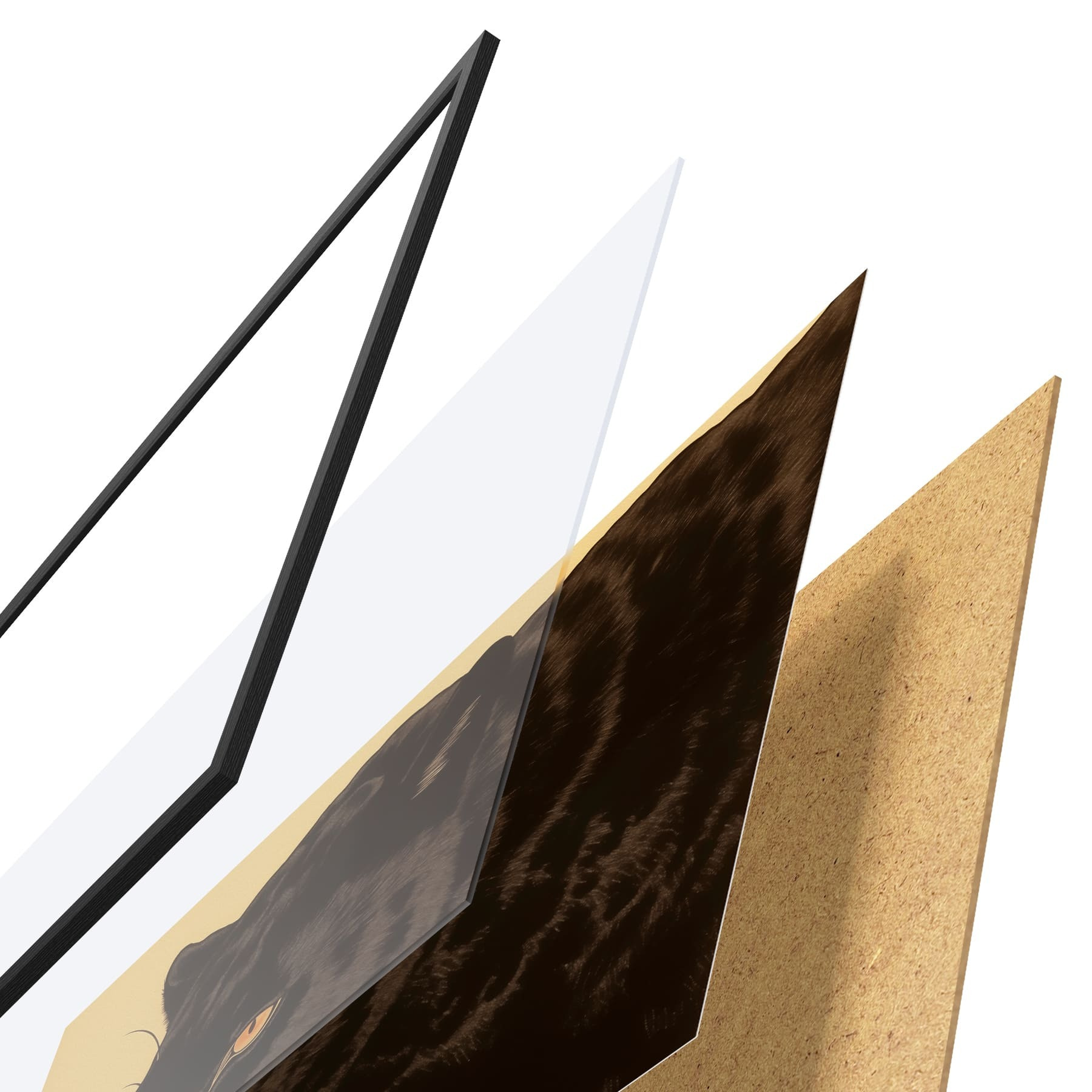 De poster bestaat uit een frame, plexiglas, geprinte afbeelding en spaanplaat achterkant. De poster kan meteen aan de muur worden gehangen dankzij de bevestigingen op de achterkant.
