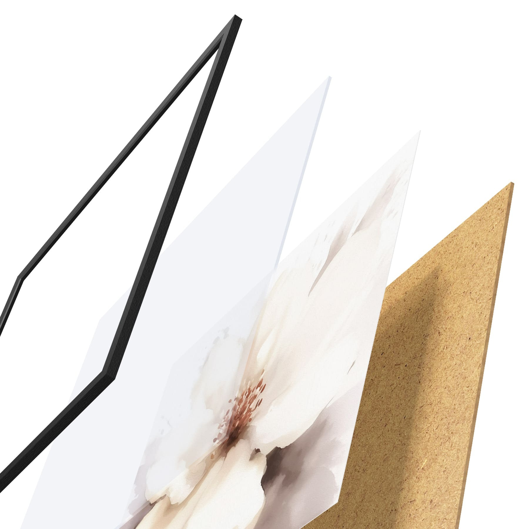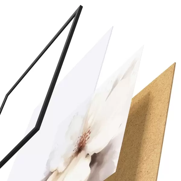De poster bestaat uit een frame, plexiglas, geprinte afbeelding en spaanplaat achterkant. De poster kan meteen aan de muur worden gehangen dankzij de bevestigingen op de achterkant.