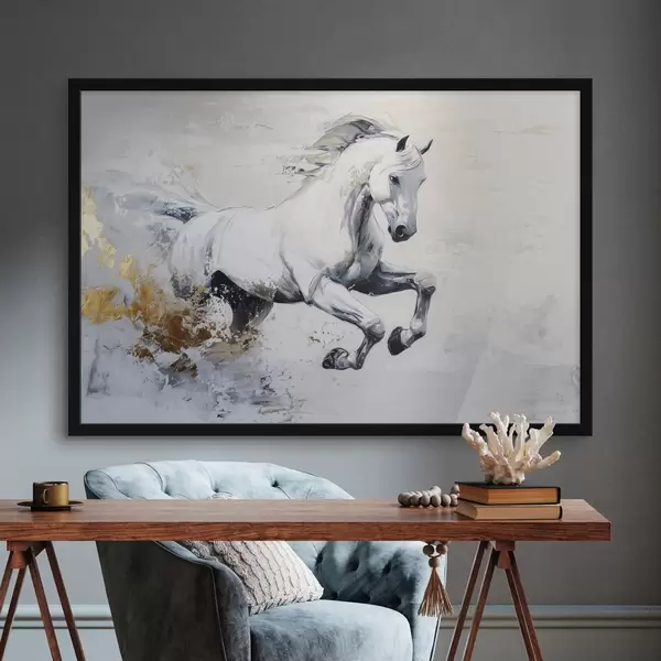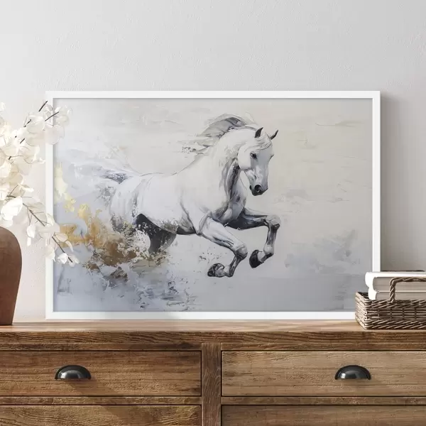 Poster Lopend wit paard, olieverf tekening, dieren f43498