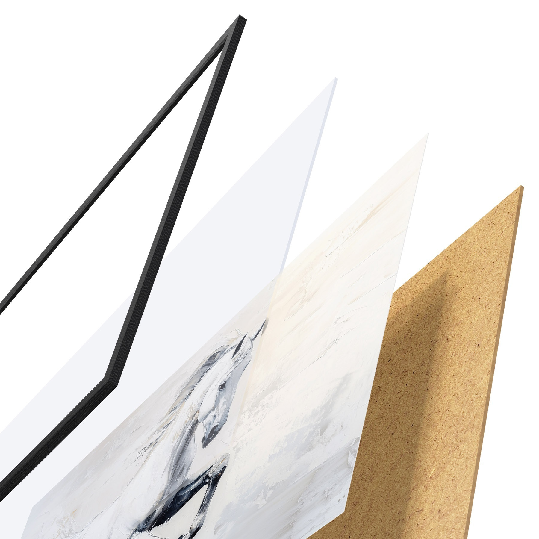 De poster bestaat uit een frame, plexiglas, geprinte afbeelding en spaanplaat achterkant. De poster kan meteen aan de muur worden gehangen dankzij de bevestigingen op de achterkant.
