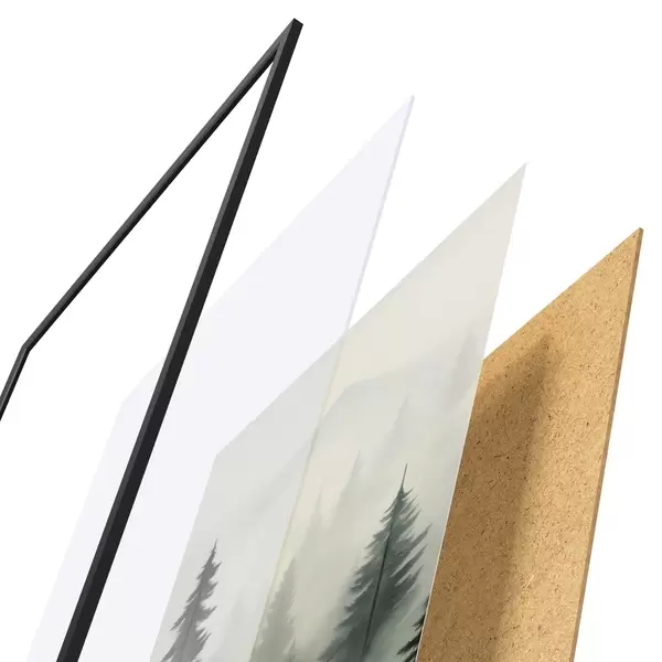De poster bestaat uit een frame, plexiglas, geprinte afbeelding en spaanplaat achterkant. De poster kan meteen aan de muur worden gehangen dankzij de bevestigingen op de achterkant.