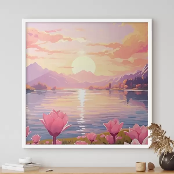 Poster Landschap met vijver op de achtergrond van bergen Nr f43523
