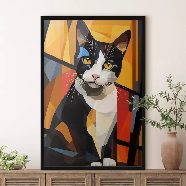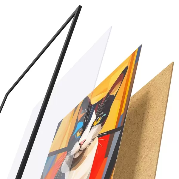 De poster bestaat uit een frame, plexiglas, geprinte afbeelding en spaanplaat achterkant. De poster kan meteen aan de muur worden gehangen dankzij de bevestigingen op de achterkant.
