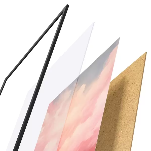 De poster bestaat uit een frame, plexiglas, geprinte afbeelding en spaanplaat achterkant. De poster kan meteen aan de muur worden gehangen dankzij de bevestigingen op de achterkant.