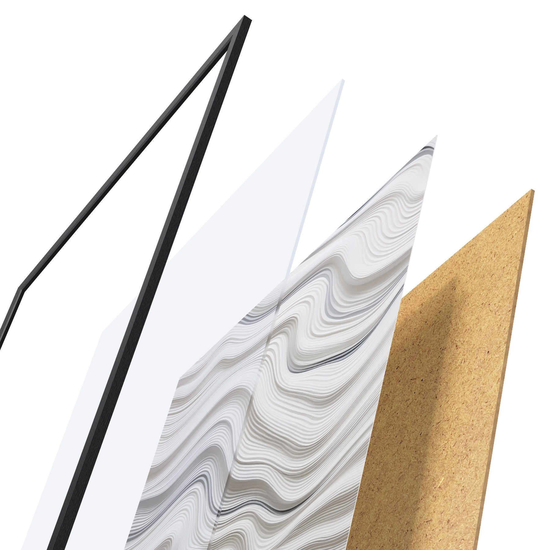 De poster bestaat uit een frame, plexiglas, geprinte afbeelding en spaanplaat achterkant. De poster kan meteen aan de muur worden gehangen dankzij de bevestigingen op de achterkant.
