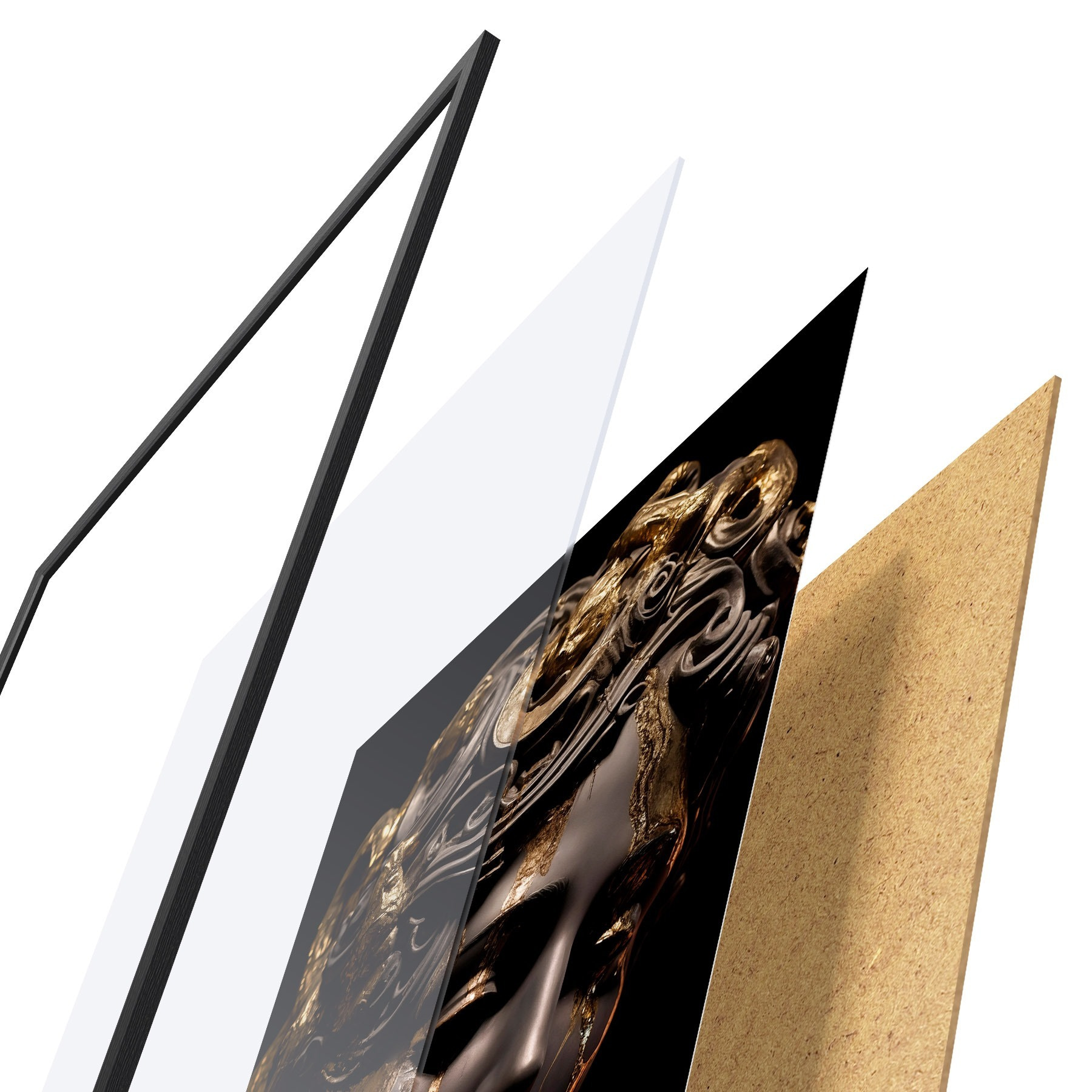 De poster bestaat uit een frame, plexiglas, geprinte afbeelding en spaanplaat achterkant. De poster kan meteen aan de muur worden gehangen dankzij de bevestigingen op de achterkant.