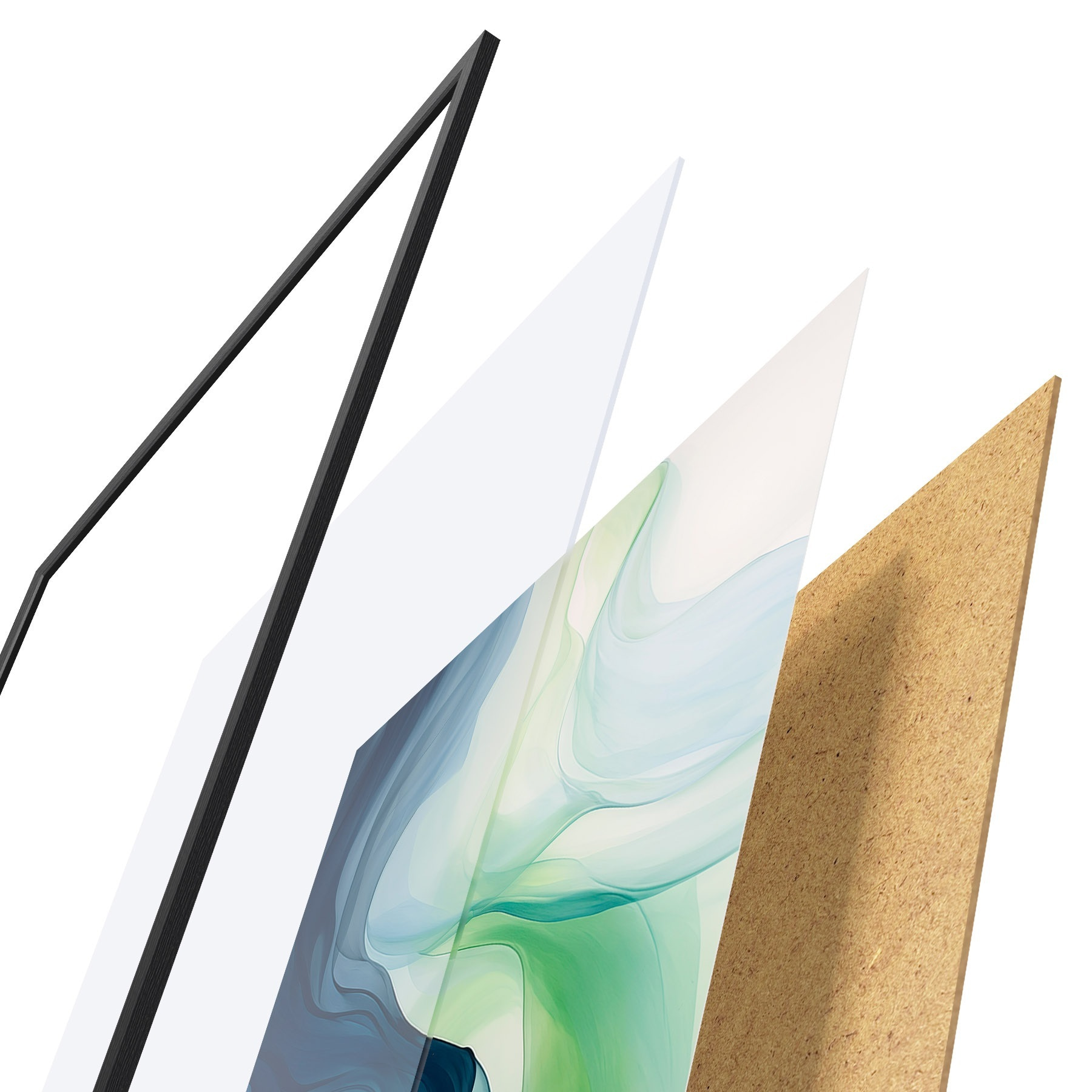 De poster bestaat uit een frame, plexiglas, geprinte afbeelding en spaanplaat achterkant. De poster kan meteen aan de muur worden gehangen dankzij de bevestigingen op de achterkant.