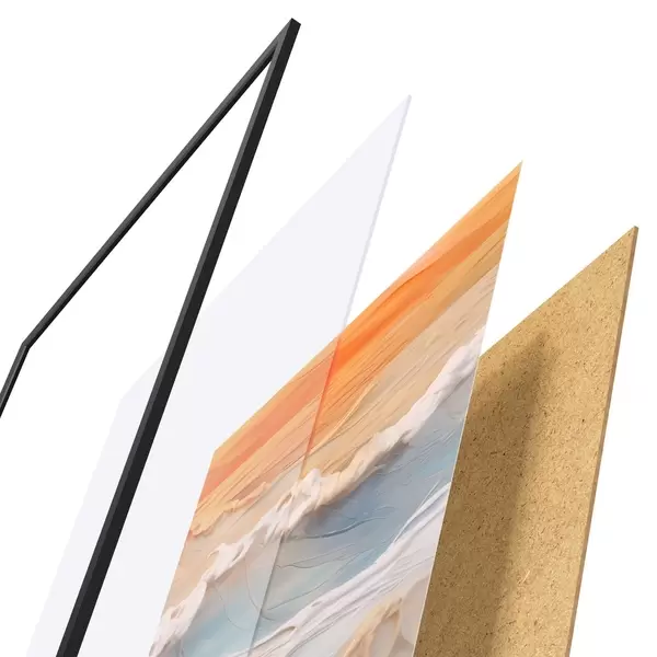 De poster bestaat uit een frame, plexiglas, geprinte afbeelding en spaanplaat achterkant. De poster kan meteen aan de muur worden gehangen dankzij de bevestigingen op de achterkant.