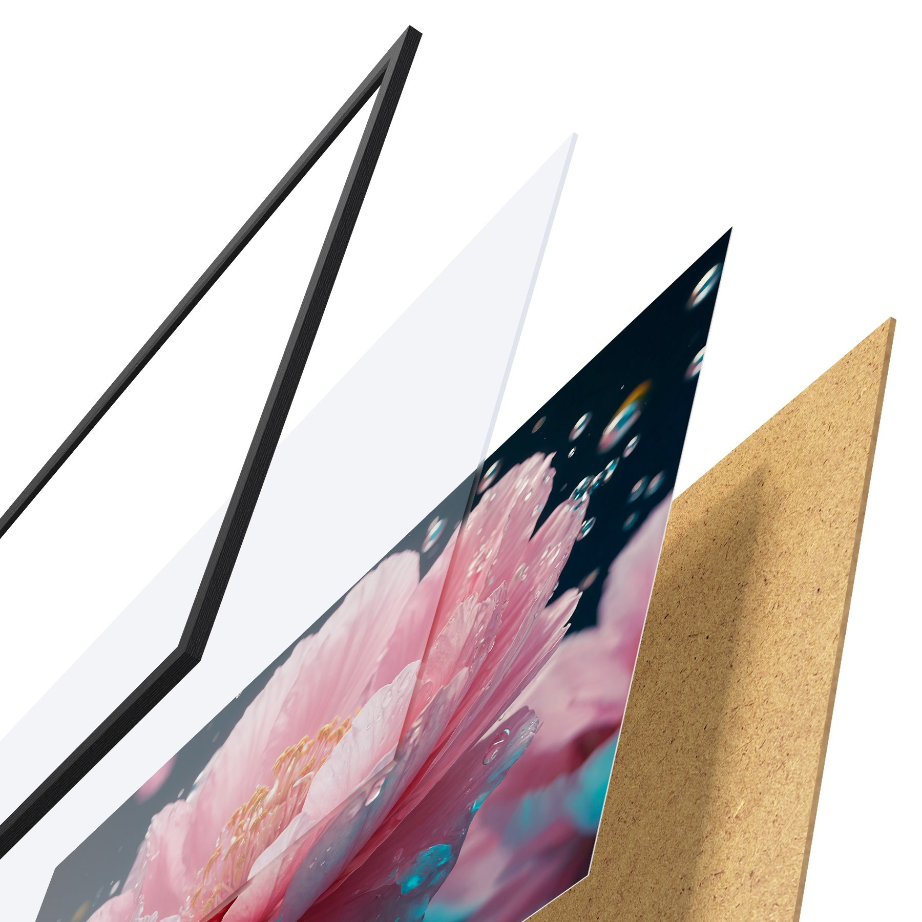 De poster bestaat uit een frame, plexiglas, geprinte afbeelding en spaanplaat achterkant. De poster kan meteen aan de muur worden gehangen dankzij de bevestigingen op de achterkant.