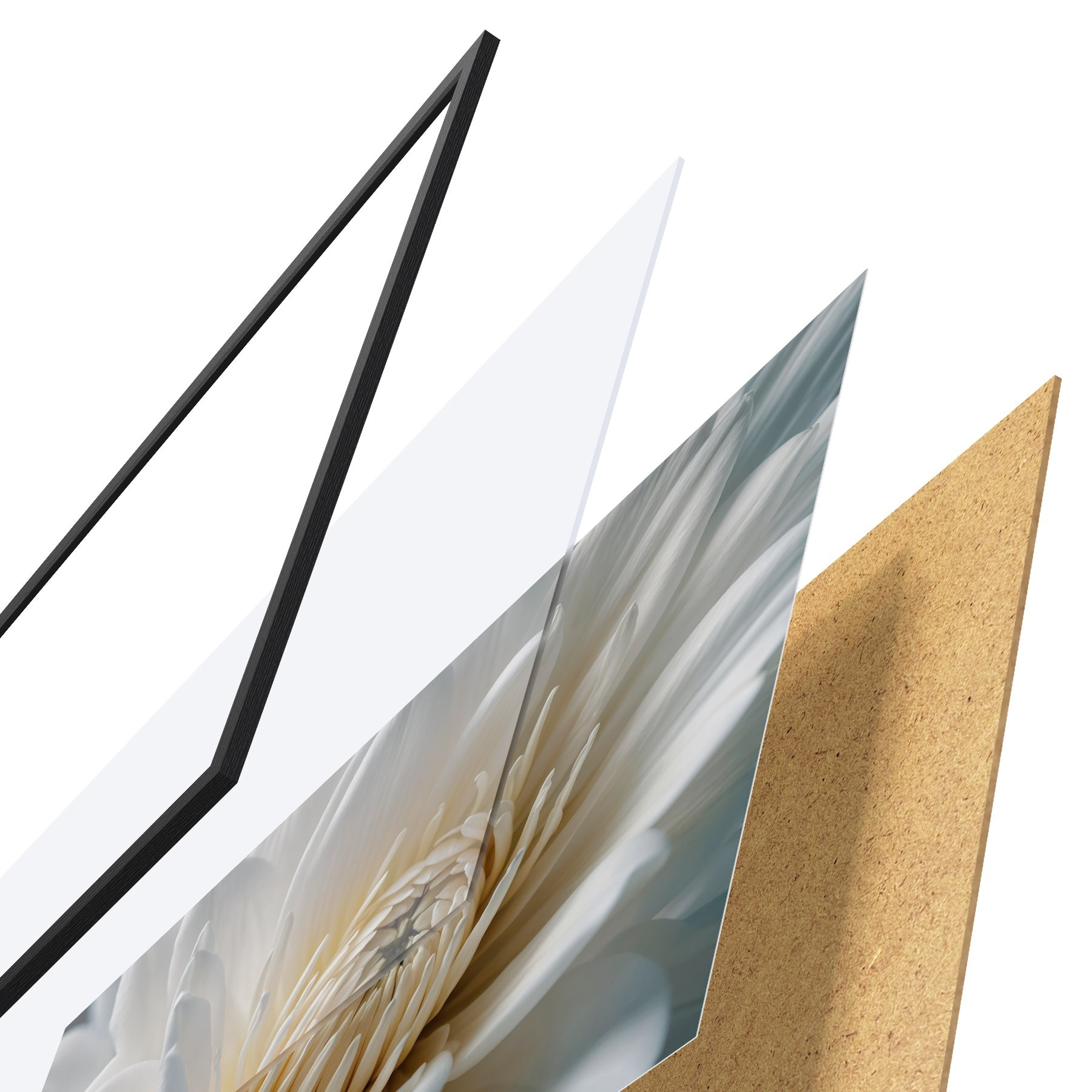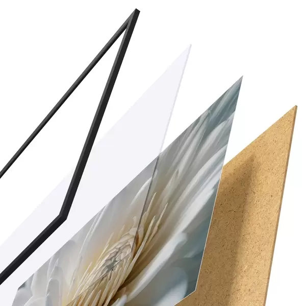 De poster bestaat uit een frame, plexiglas, geprinte afbeelding en spaanplaat achterkant. De poster kan meteen aan de muur worden gehangen dankzij de bevestigingen op de achterkant.