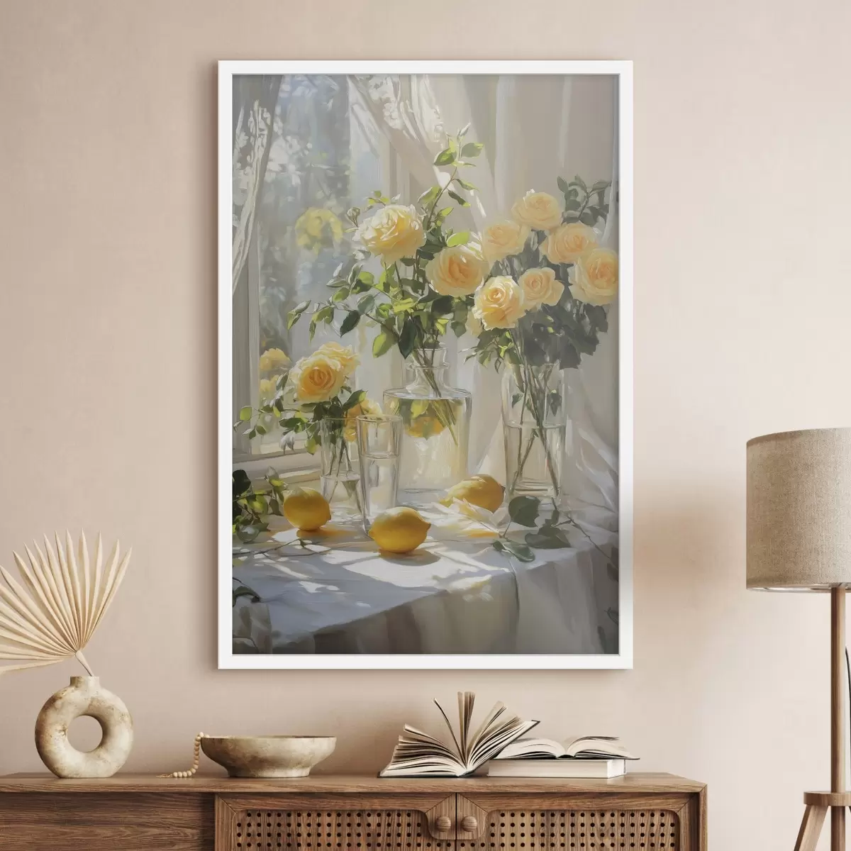 Poster Rozen in vazen, tekening in olieverfstijl, zacht zonlicht, citroenen, lente f43887