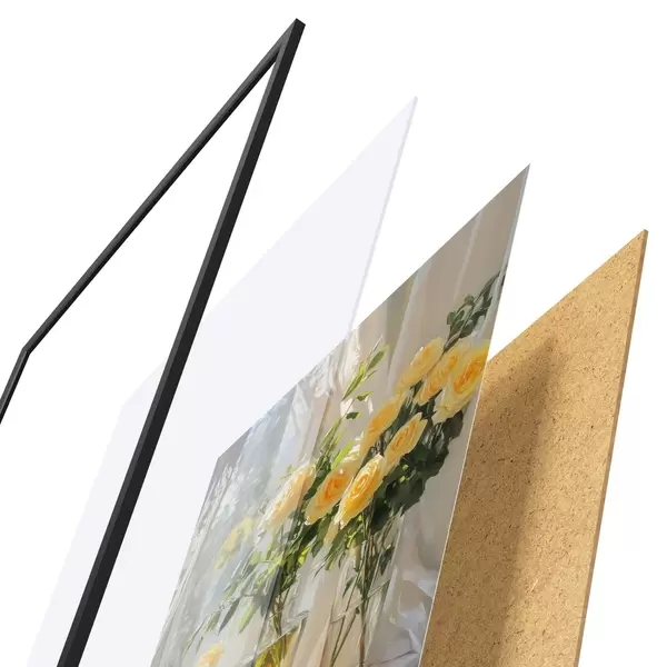 De poster bestaat uit een frame, plexiglas, geprinte afbeelding en spaanplaat achterkant. De poster kan meteen aan de muur worden gehangen dankzij de bevestigingen op de achterkant.