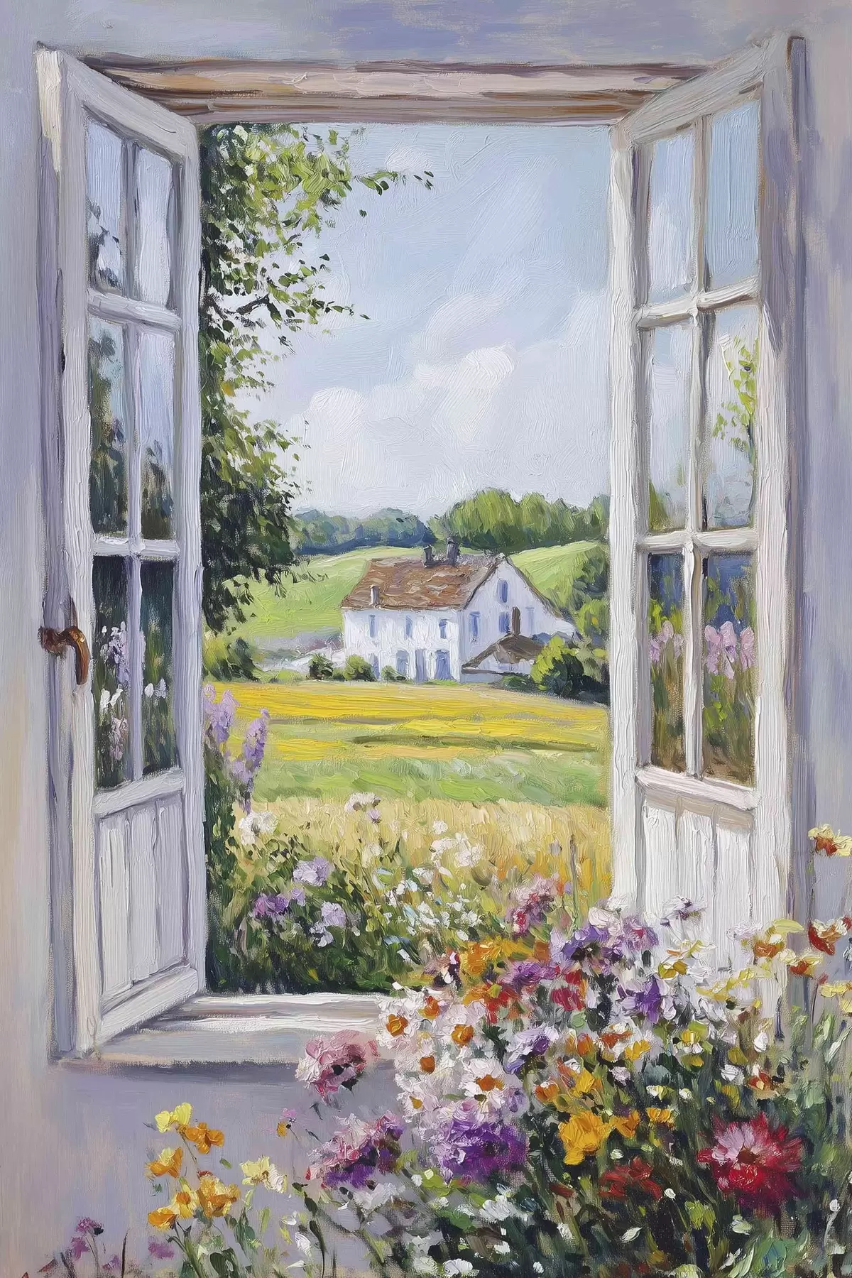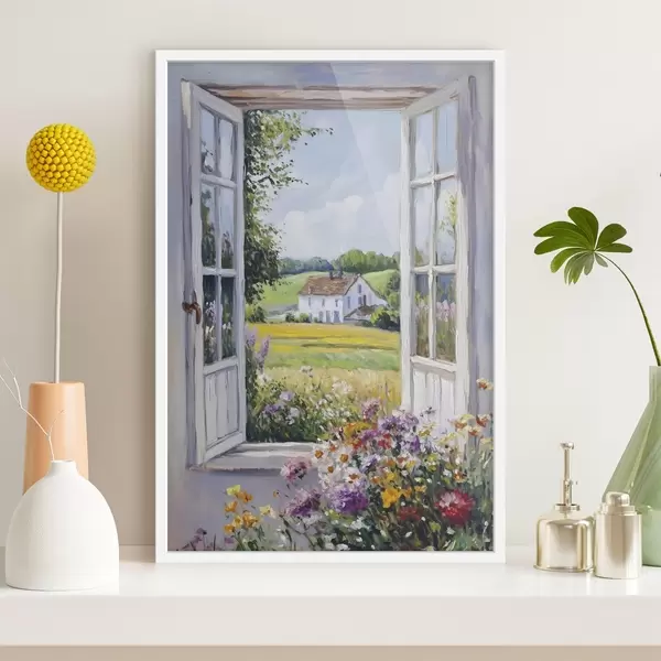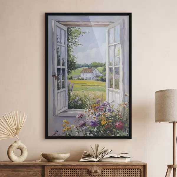 Poster Dorpslandschappen in het houten venster, bloemen, velden, olieverfstijl, boerderij Nr f43888