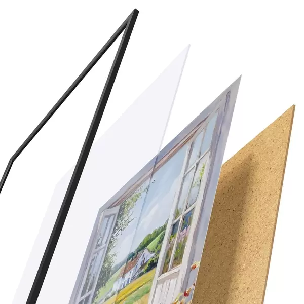 De poster bestaat uit een frame, plexiglas, geprinte afbeelding en spaanplaat achterkant. De poster kan meteen aan de muur worden gehangen dankzij de bevestigingen op de achterkant.