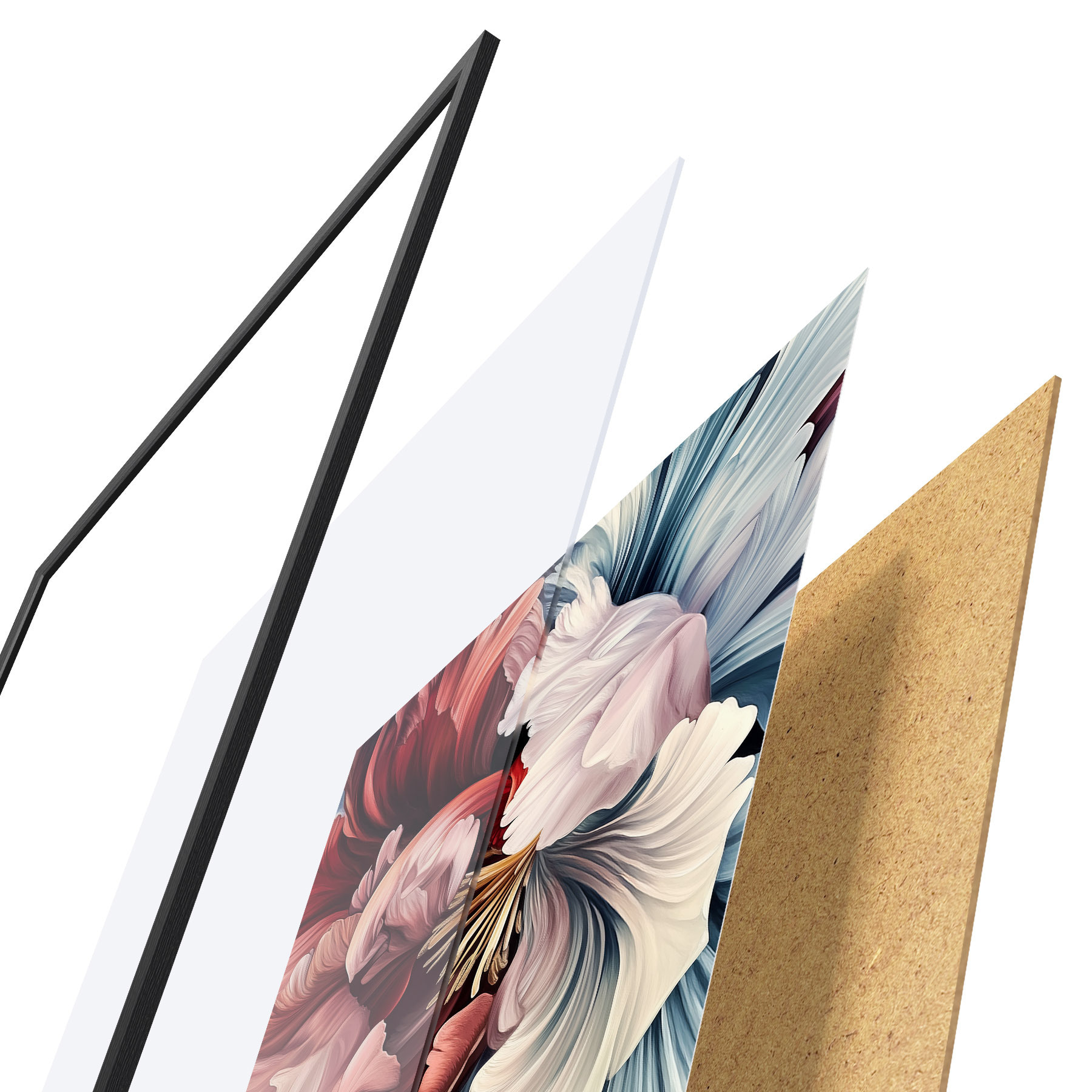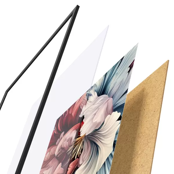 De poster bestaat uit een frame, plexiglas, geprinte afbeelding en spaanplaat achterkant. De poster kan meteen aan de muur worden gehangen dankzij de bevestigingen op de achterkant.