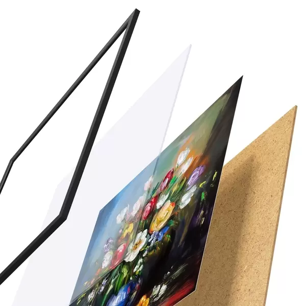 De poster bestaat uit een frame, plexiglas, geprinte afbeelding en spaanplaat achterkant. De poster kan meteen aan de muur worden gehangen dankzij de bevestigingen op de achterkant.
