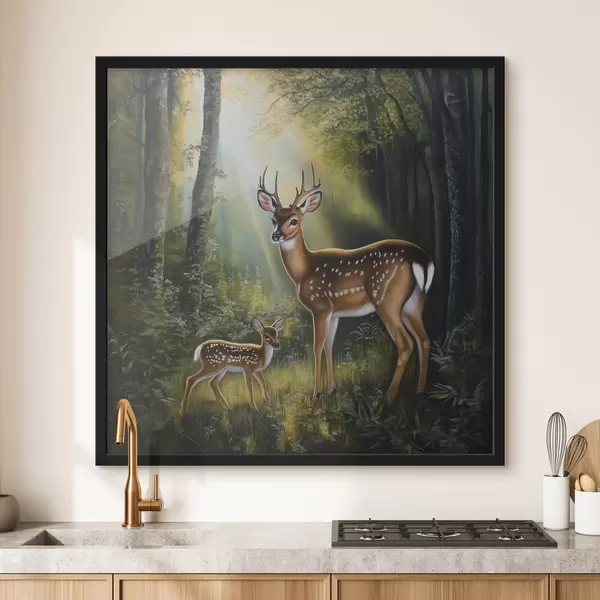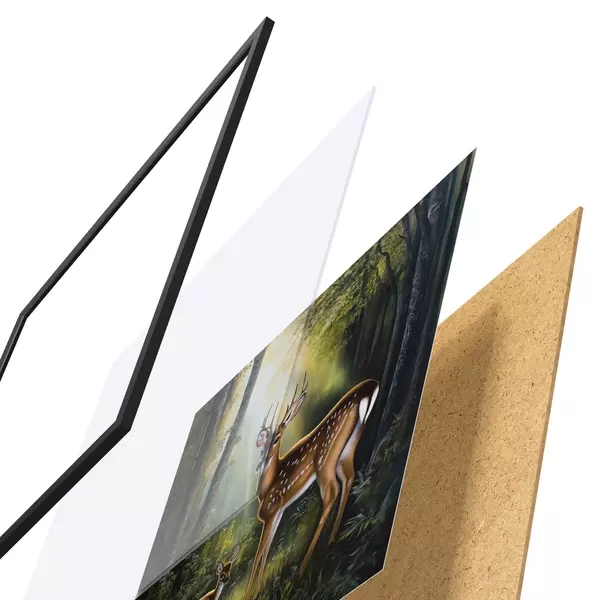 De poster bestaat uit een frame, plexiglas, geprinte afbeelding en spaanplaat achterkant. De poster kan meteen aan de muur worden gehangen dankzij de bevestigingen op de achterkant.