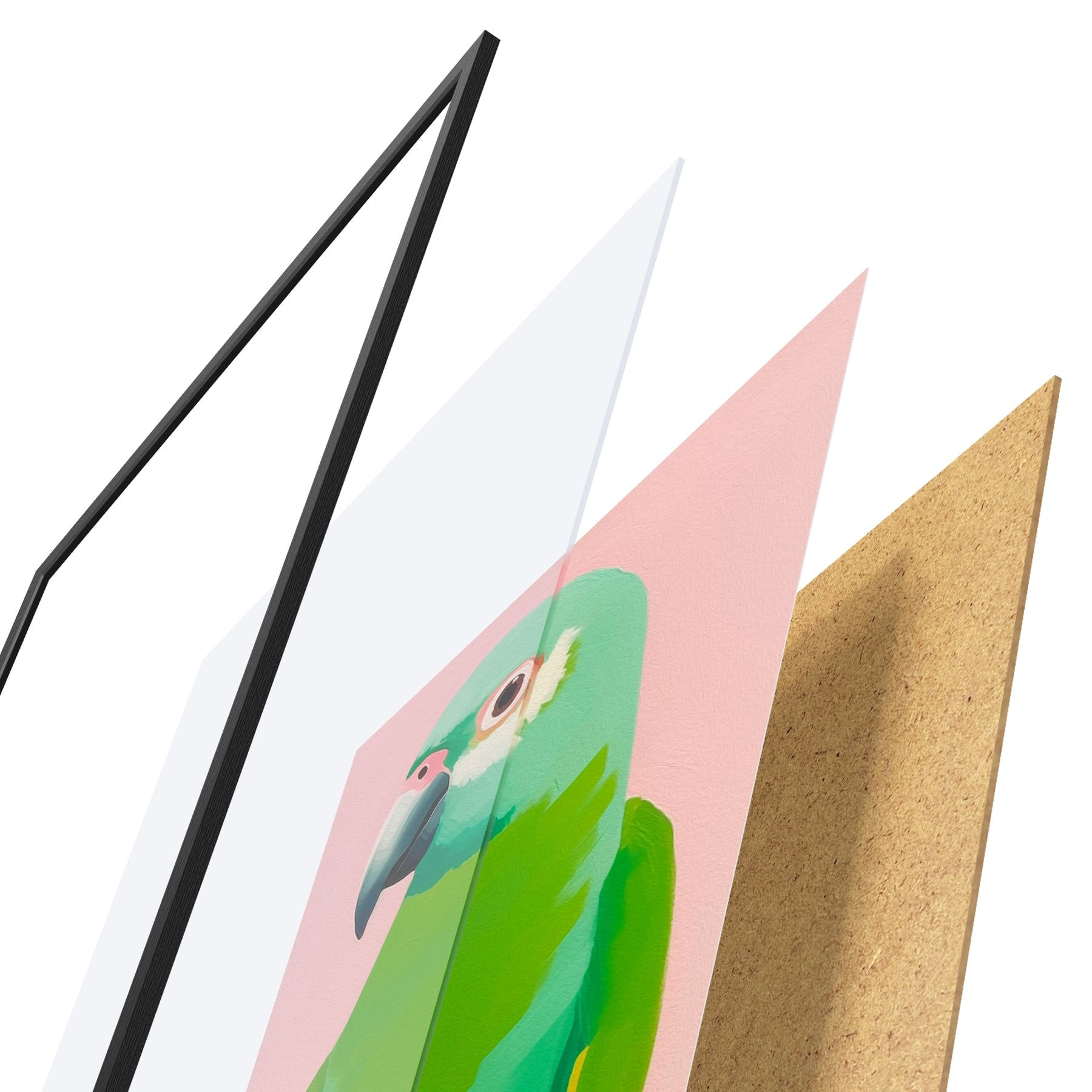 De poster bestaat uit een frame, plexiglas, geprinte afbeelding en spaanplaat achterkant. De poster kan meteen aan de muur worden gehangen dankzij de bevestigingen op de achterkant.