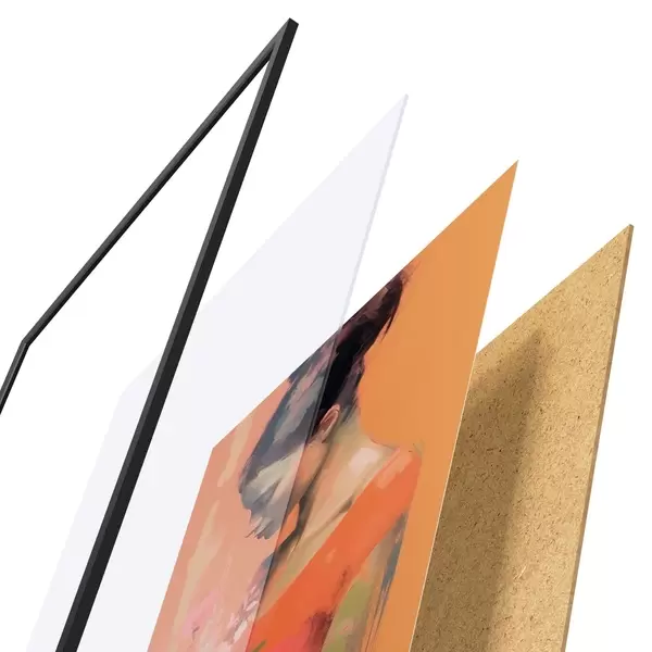 De poster bestaat uit een frame, plexiglas, geprinte afbeelding en spaanplaat achterkant. De poster kan meteen aan de muur worden gehangen dankzij de bevestigingen op de achterkant.
