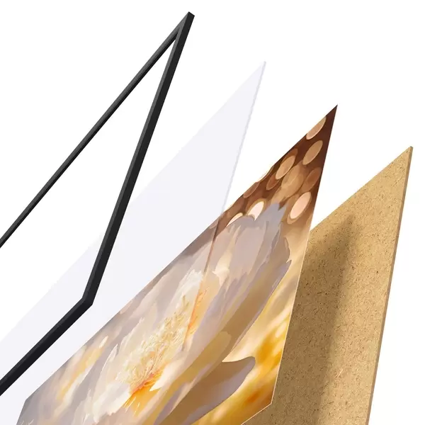 De poster bestaat uit een frame, plexiglas, geprinte afbeelding en spaanplaat achterkant. De poster kan meteen aan de muur worden gehangen dankzij de bevestigingen op de achterkant.