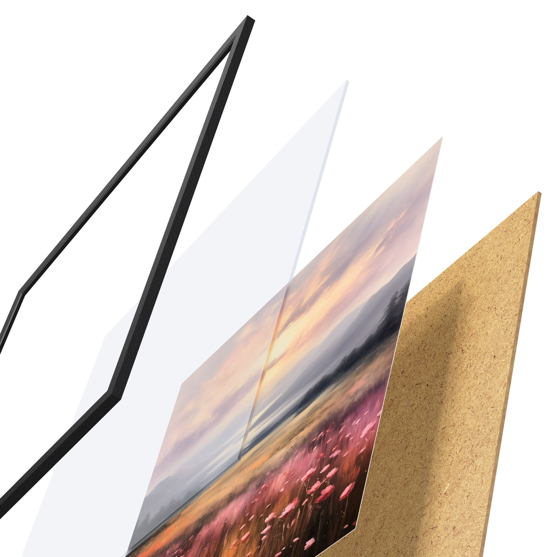 De poster bestaat uit een frame, plexiglas, geprinte afbeelding en spaanplaat achterkant. De poster kan meteen aan de muur worden gehangen dankzij de bevestigingen op de achterkant.