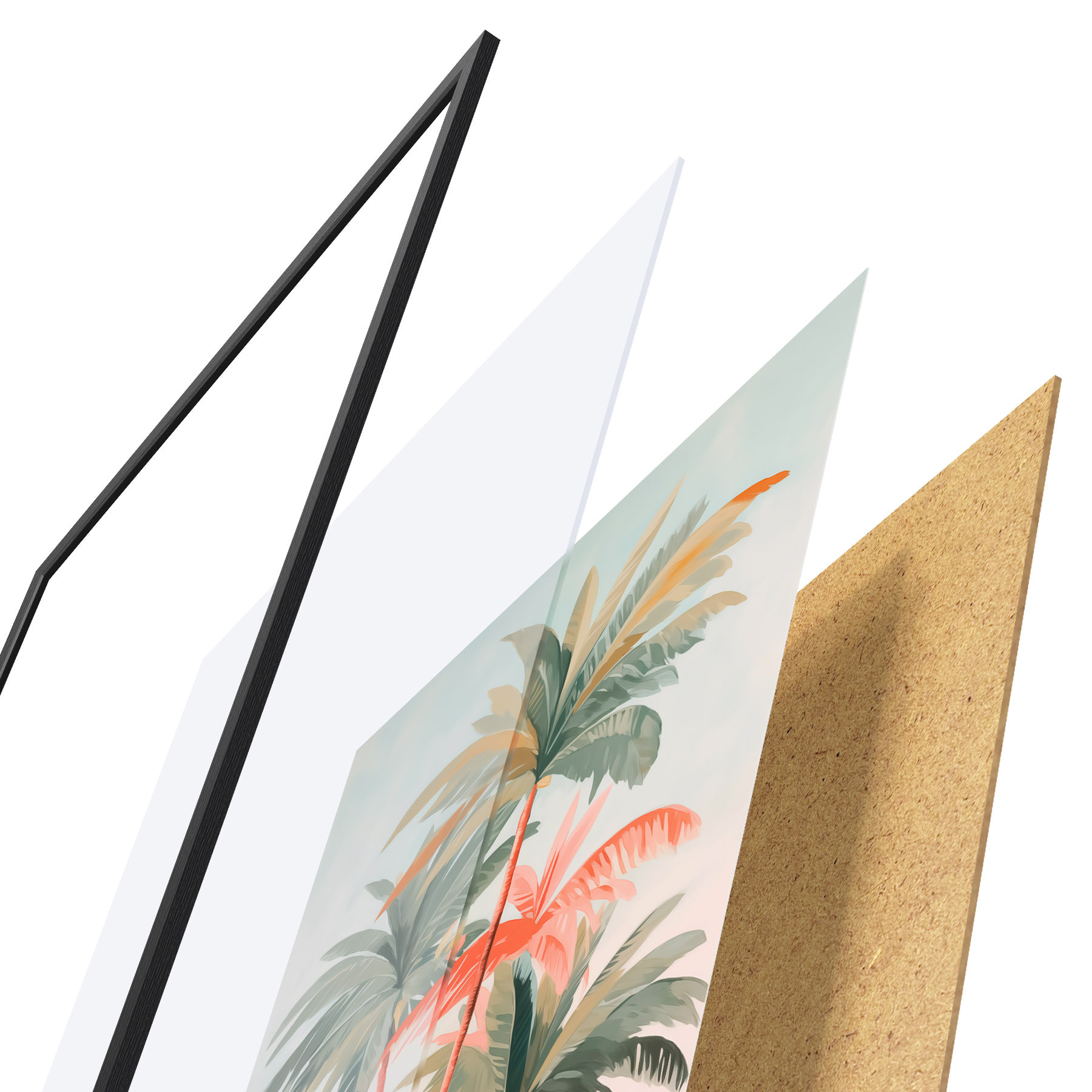 De poster bestaat uit een frame, plexiglas, geprinte afbeelding en spaanplaat achterkant. De poster kan meteen aan de muur worden gehangen dankzij de bevestigingen op de achterkant.