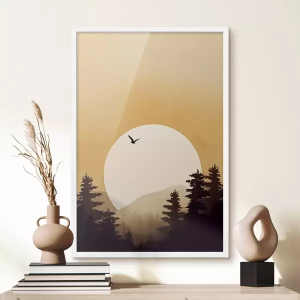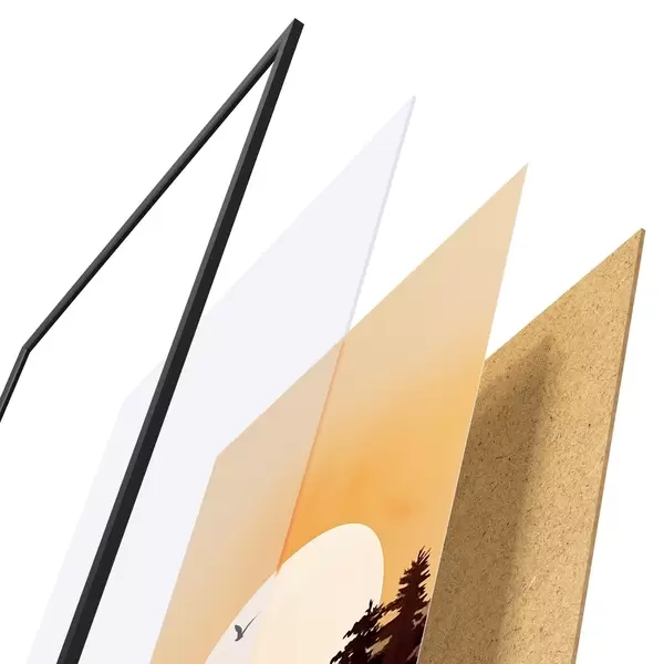 De poster bestaat uit een frame, plexiglas, geprinte afbeelding en spaanplaat achterkant. De poster kan meteen aan de muur worden gehangen dankzij de bevestigingen op de achterkant.