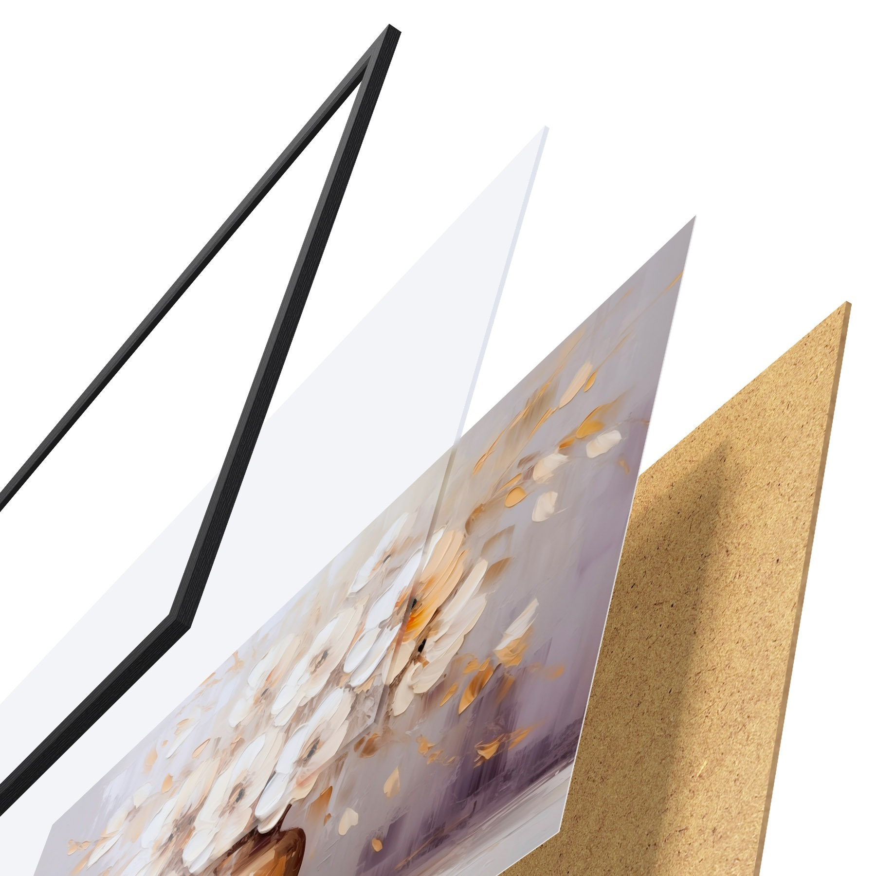 De poster bestaat uit een frame, plexiglas, geprinte afbeelding en spaanplaat achterkant. De poster kan meteen aan de muur worden gehangen dankzij de bevestigingen op de achterkant.